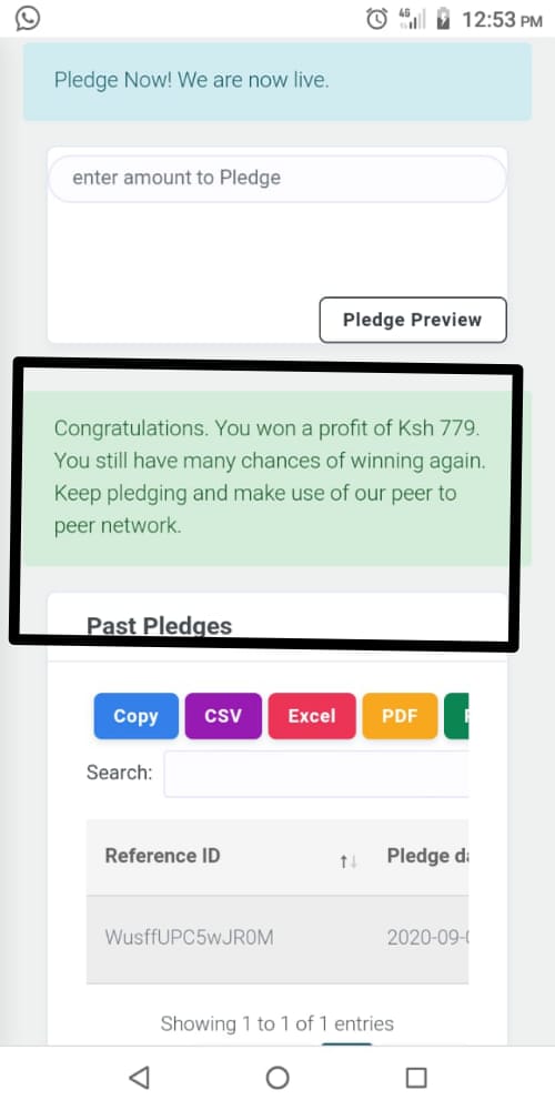 According to ardent web online, you can pledge a certain amount and you will get a chance to win 50% of the amount or lose 50% of the amount you pledged after 12 hours. For example, if you pledge Kshs 1000, after 12 hours you will either gain Kshs 500 and have Kshs 1500 in total or you can lose Kshs 500 and end up with Kshs 500. Ardent web online is not clear on what they do with the cash for that period of 12 hours so my advice is you avoid pledging if you can.