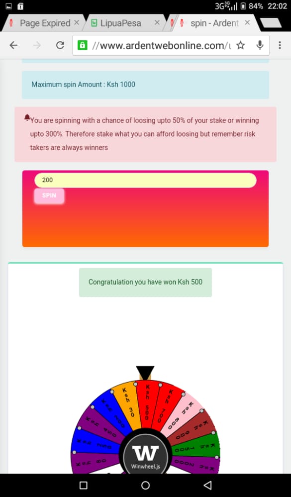 Normal spin:this type of spin is where you place a bet staking between Kshs 100 to Kshs 1000. It is a risk where you can lose or win. You can stake once and win huge amount the same way you can stake a lot of times and keep on losing. In simple term, don’t join because you just want to use the spin. It is not a get rich quick scheme. If you join ardent web online because of spinning only it might end in tears.